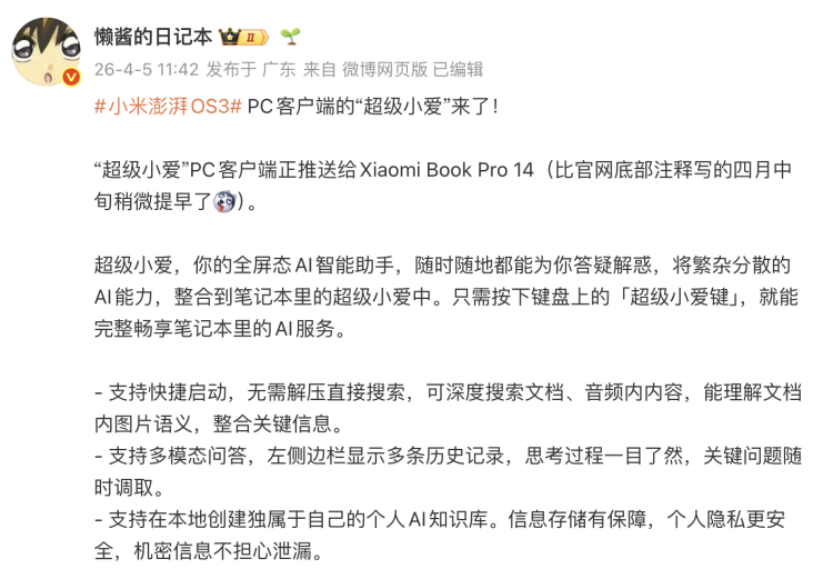 近日,小米滂湃OS 3的AI核心核心“超等小爱”似乎正迎来一波密集的全生态进化,不仅在挪动端迎来了包含五大核心功能的V7.12重磅大升级万博manbext体育官网app官网,其PC客户端也已悄然提前向部分小米札记本用户推送。