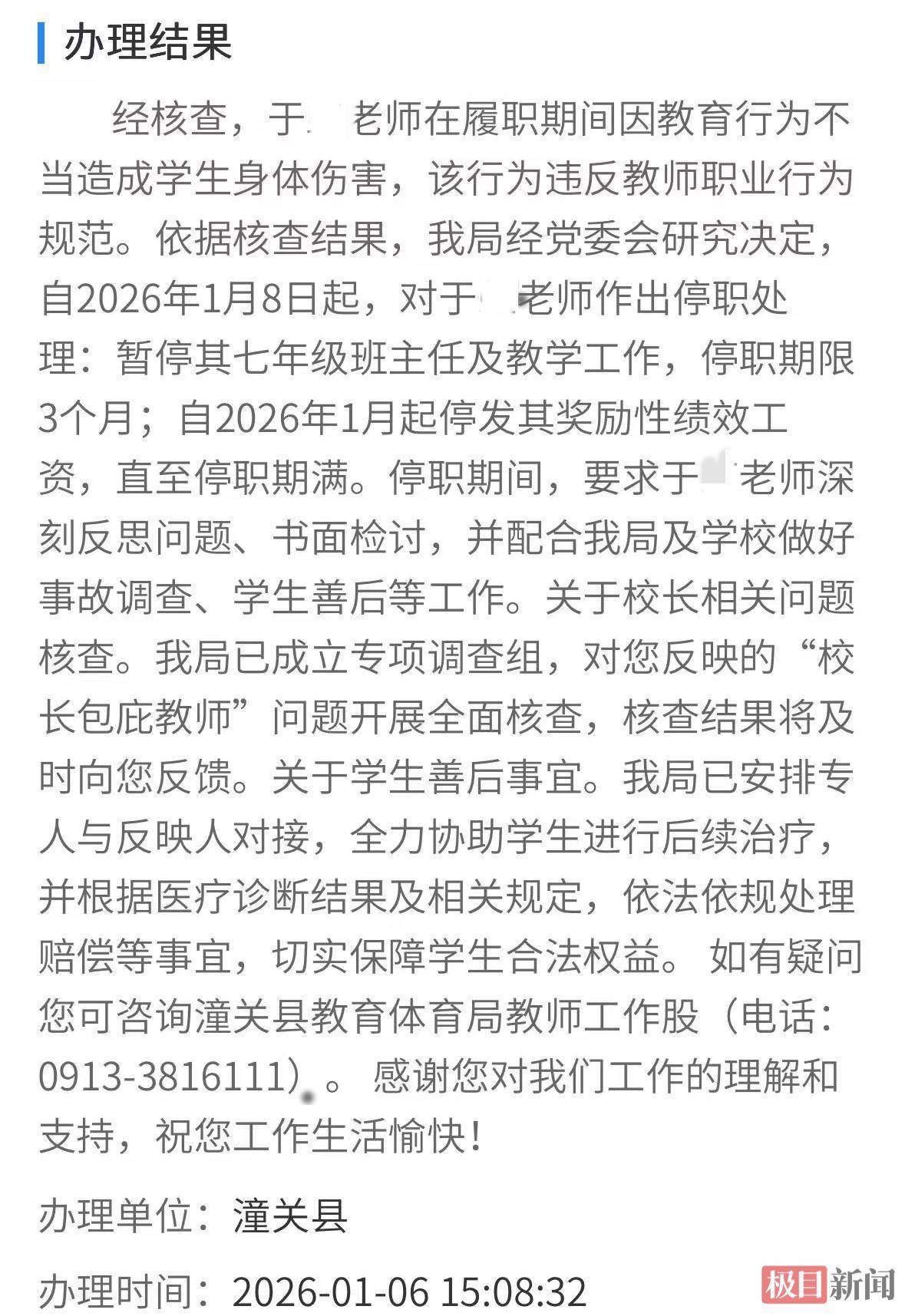 1月6日,潼关县教体局通过12345回复:经核查,于某在履职手艺因教悔活动不当酿成学生体魄伤害,违犯磨真金不怕火行状活动轨范。该局经党委会研究决定,自1月8日起,于某停职3个月;停职期满前停发其奖励性绩效工资;停职手艺,条目于某久了反想问题、书面检查,并合作该局及学校作念功德故侦察、学生善后等职责。