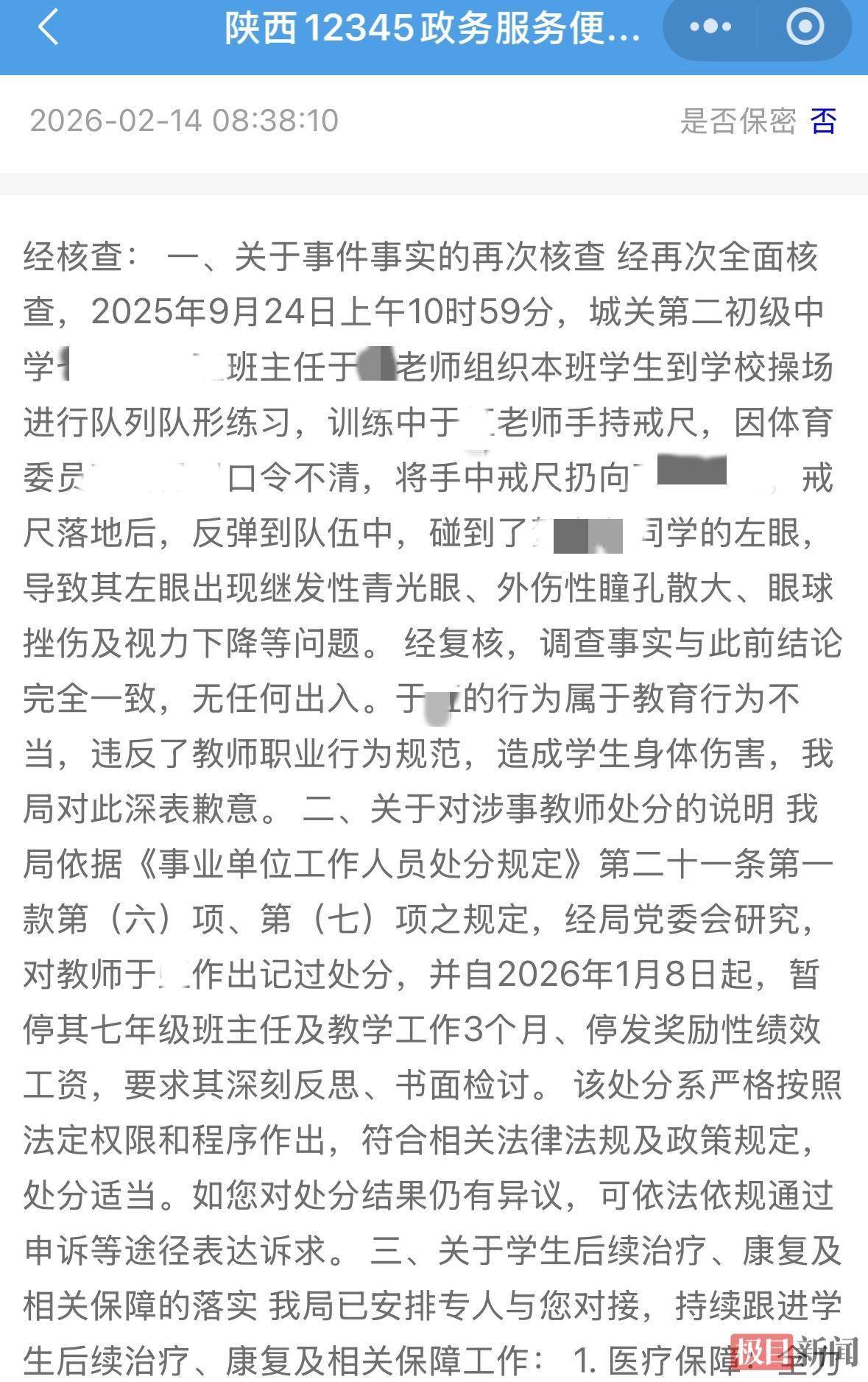 回复称,经再次核查,2025年9月24日10时59分,班主任于某组织本班学生在学校操场进行队伍和队形本质。本质中于某手握戒尺,因体育委员口令不清,将手中戒尺扔向体育委员。戒尺落地后,反弹到部队中,遭受了小雅的左眼,导致其左眼出现继发性青光眼、外伤性瞳孔散大、眼球毁伤及意见下落等问题。此外,该局对于某酿成小雅体魄伤害深表歉意,对于某的停职贬责改为记过贬责。